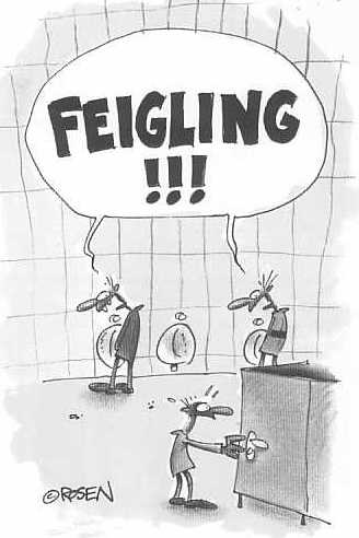 Kann nicht Pinkeln, wenn jemand zusieht. Tut, als ob er gepinkelt hat und schleicht nachher wieder zurück.
